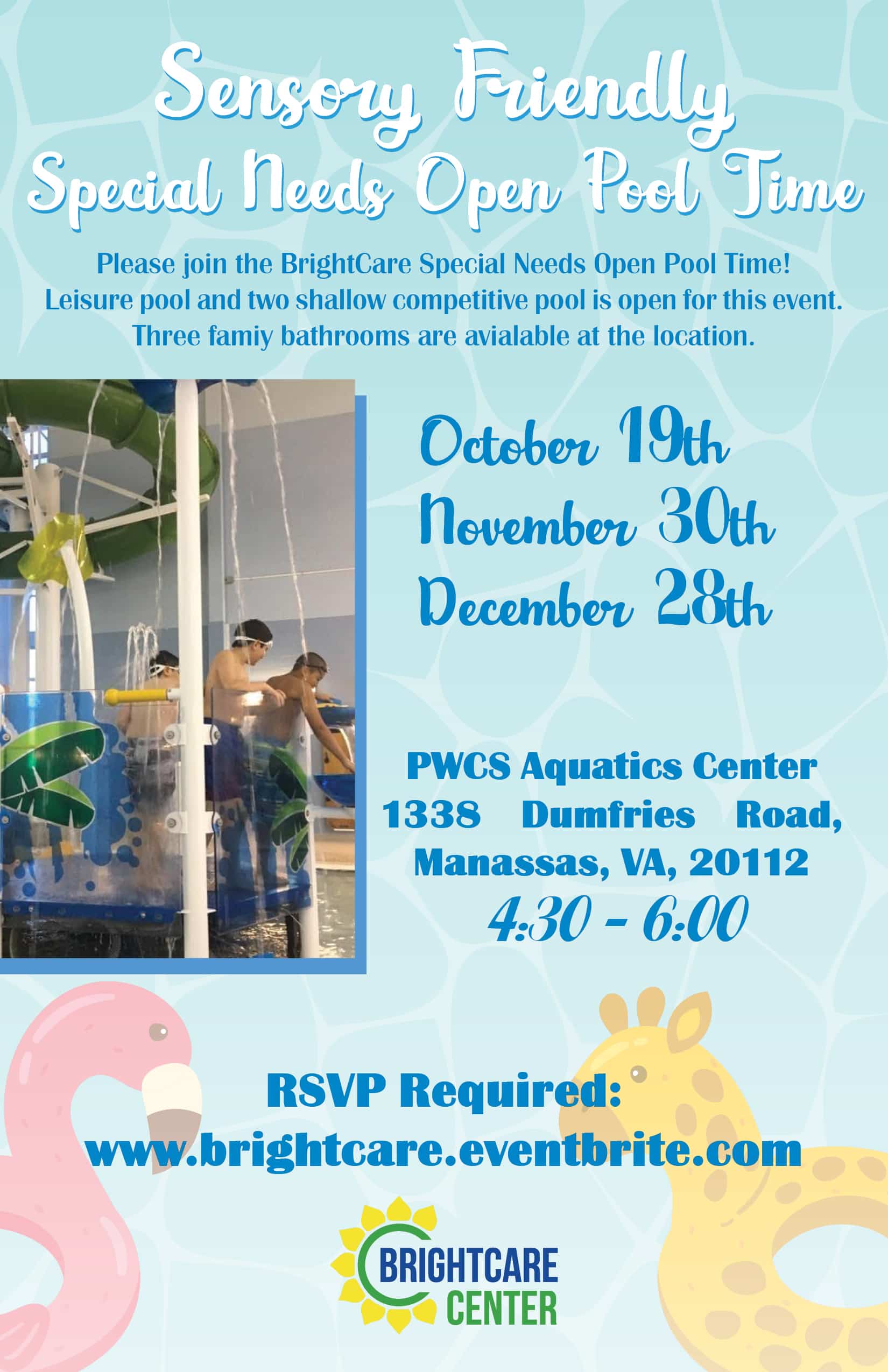 Date And Time October 19 4:30-6:00 November 30 4:30-6:00 December 28 4:30-6:00 Location PWCS Aquatics Center 1338 Dumfries Road Manassas, VA 20112 RSVP Required: www.brightcare.eventbrite.com...